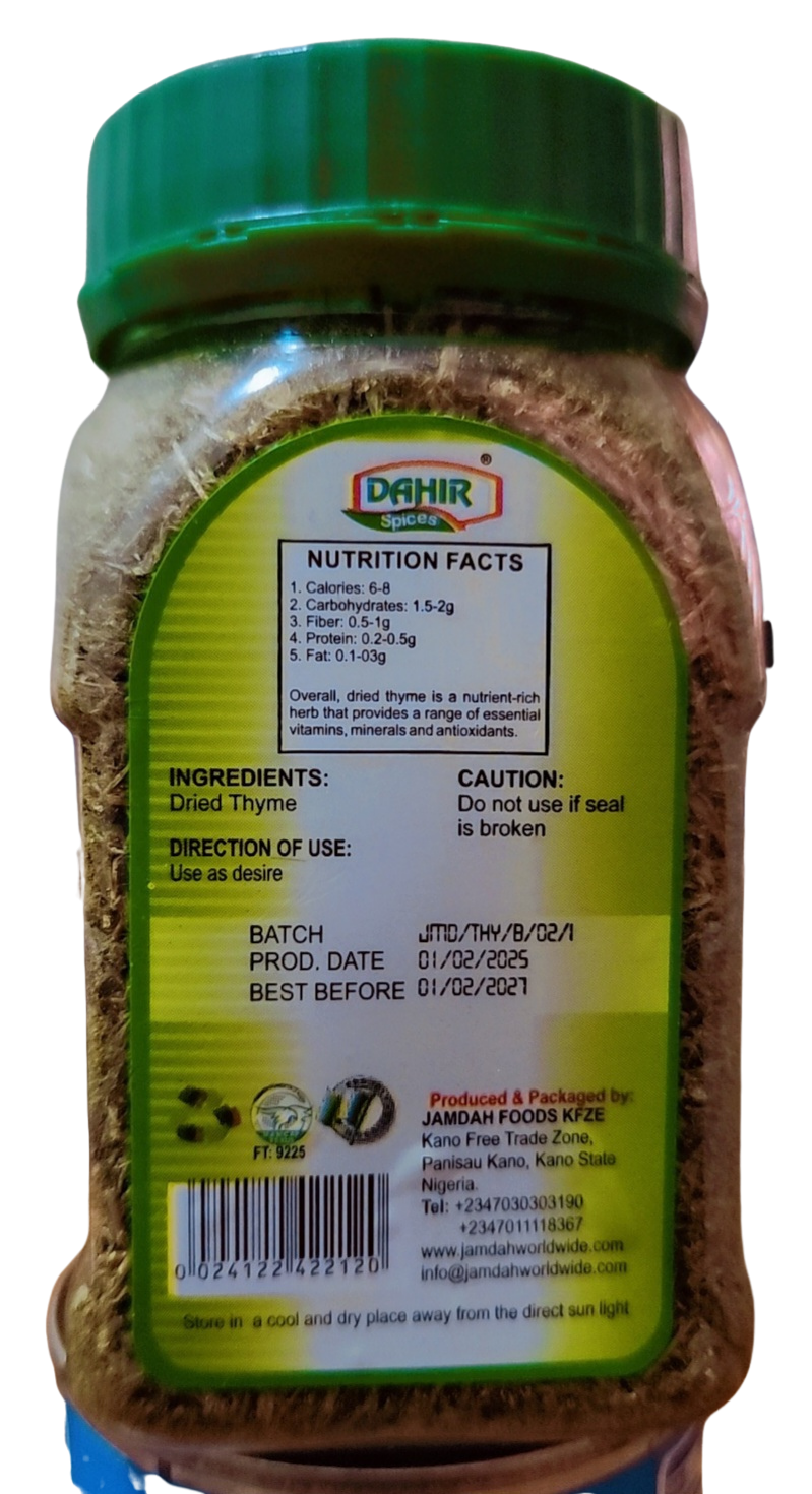 Add a burst of natural flavor and aroma to your meals with Dahir Dried Thyme, a premium herb carefully selected and packed to preserve its freshness. Known for its earthy and slightly minty taste, thyme is a must-have spice for every kitchen, perfect for elevating both local and international dishes.